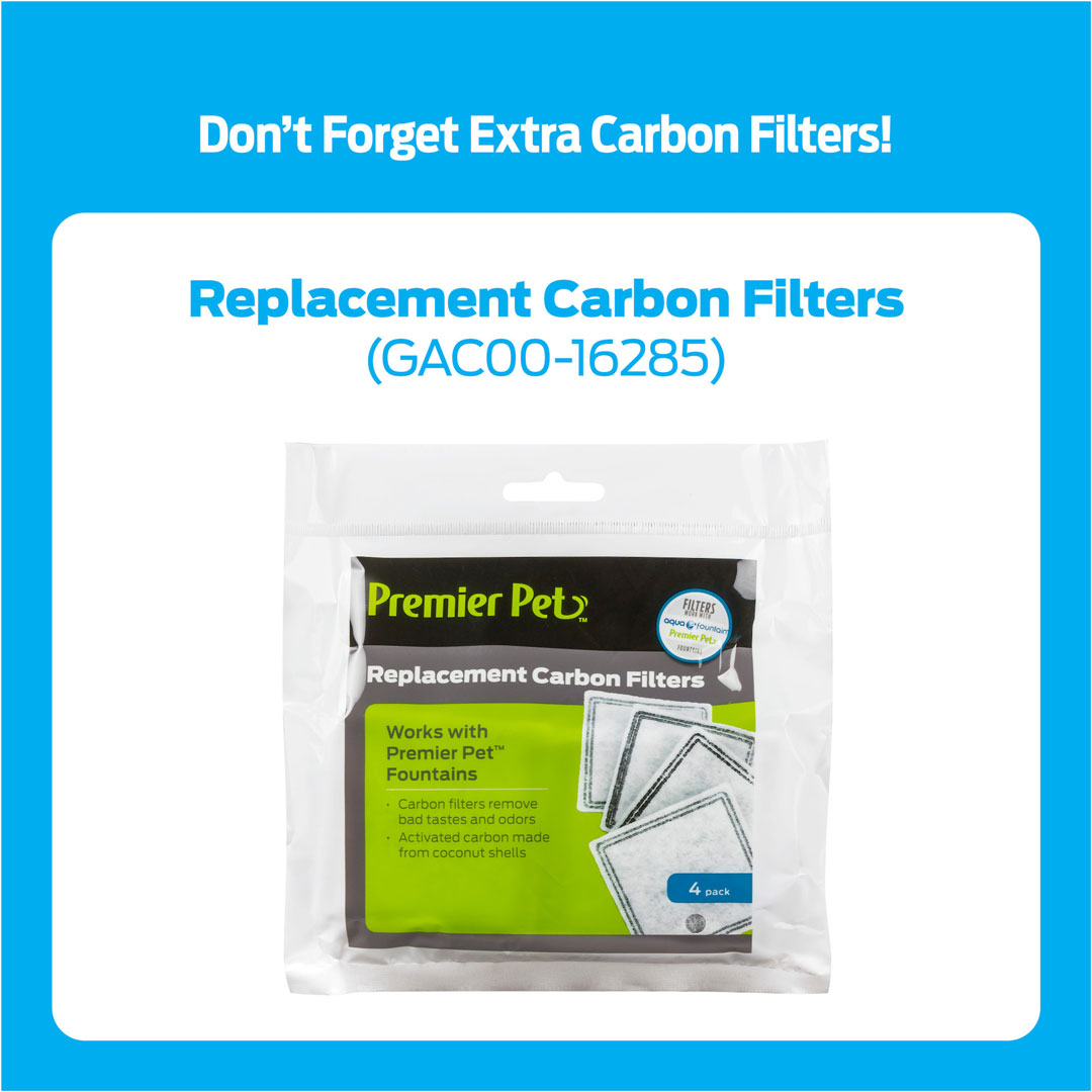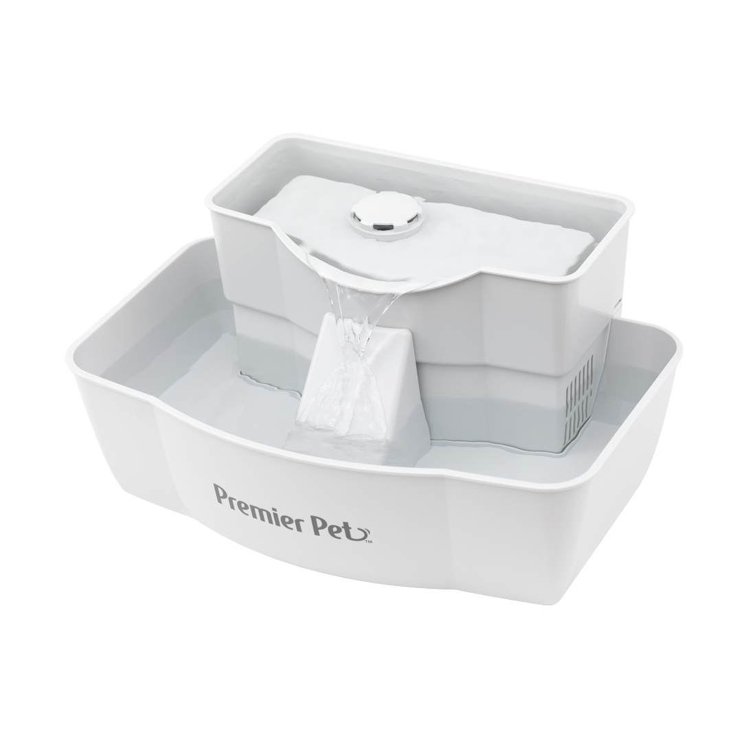 The Premier Pet® 100 oz. Pet Fountain provides your pet with 100 ounces of fresh, filtered water. Featuring a free-falling stream that encourages pets to drink more, therefore supporting urinary and kidney health through proper hydration, and a built-in filter system that includes an activated carbon filter to remove bad tastes and odors. Constant flowing water helps to prevent bacteria growth, keeping the fountain cleaner than a standing water bowl. The large water-holding capacity of up to 100 oz. makes this fountain ideal for cats, dogs of all sizes and multiple pet homes. With multiple drinking options, your pet can choose to drink from the free-falling stream, lower bowl with still water or the elevated bowl, which is great for senior or arthritic pets. The BPA-Free plastic design comes apart to make cleaning easy and is top-shelf dishwasher safe (excluding pump). Give yourself the happier, healthier pet you deserve by giving them the Premier Pet 100 oz. Pet Fountain!