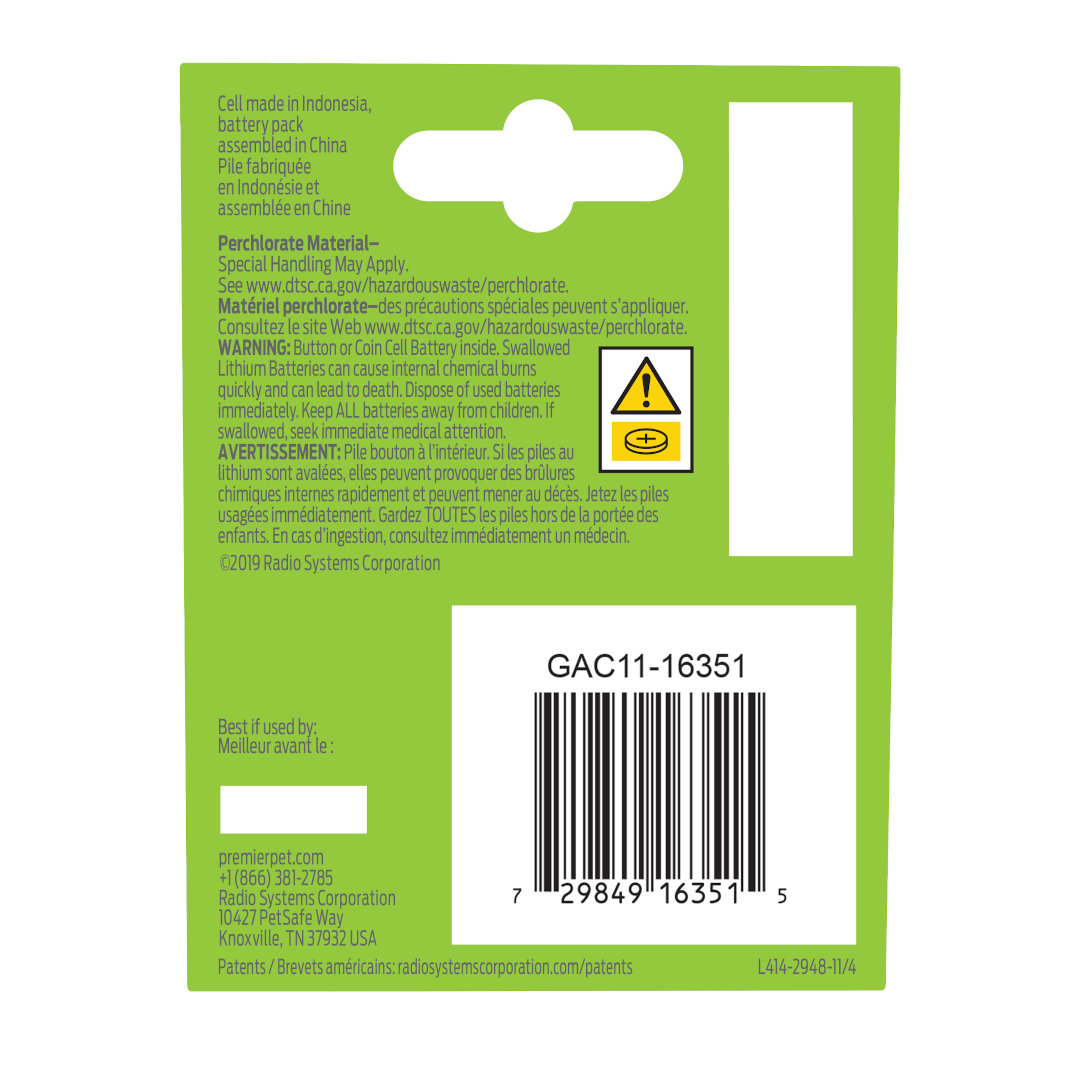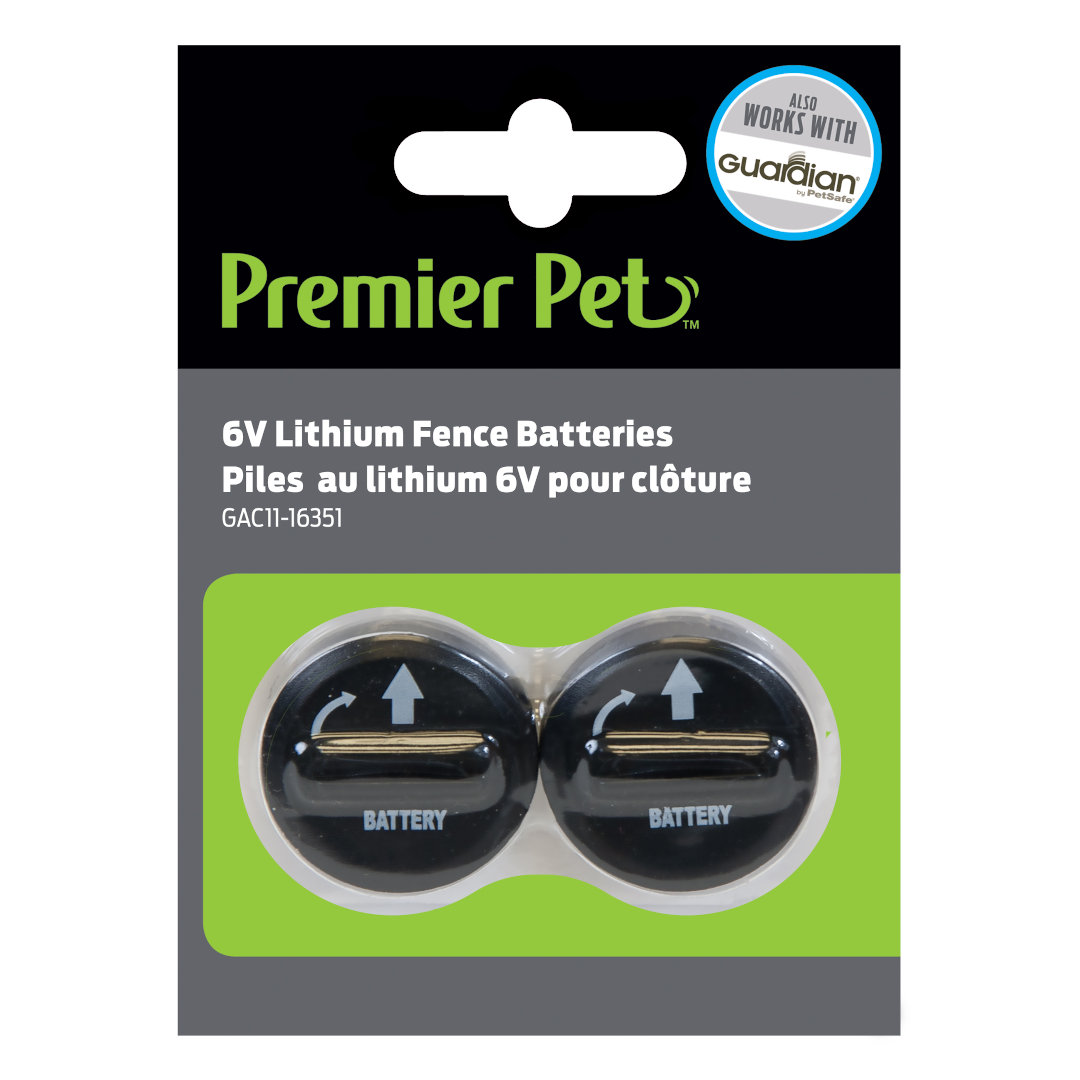 The Premier Pet® 6V Lithium Batteries are the replacement batteries for your Premier Pet™ Fence receiver collars. The battery module easily installs into the collar’s battery compartment by using a flat edge, such as the test light tool included with the collar or a coin, to twist and lock it into place. Each replacement battery should last from one to three months. Replace whenever you see the low battery indicator flashing on your collar to ensure your pet stays safely contained within his/her boundary.