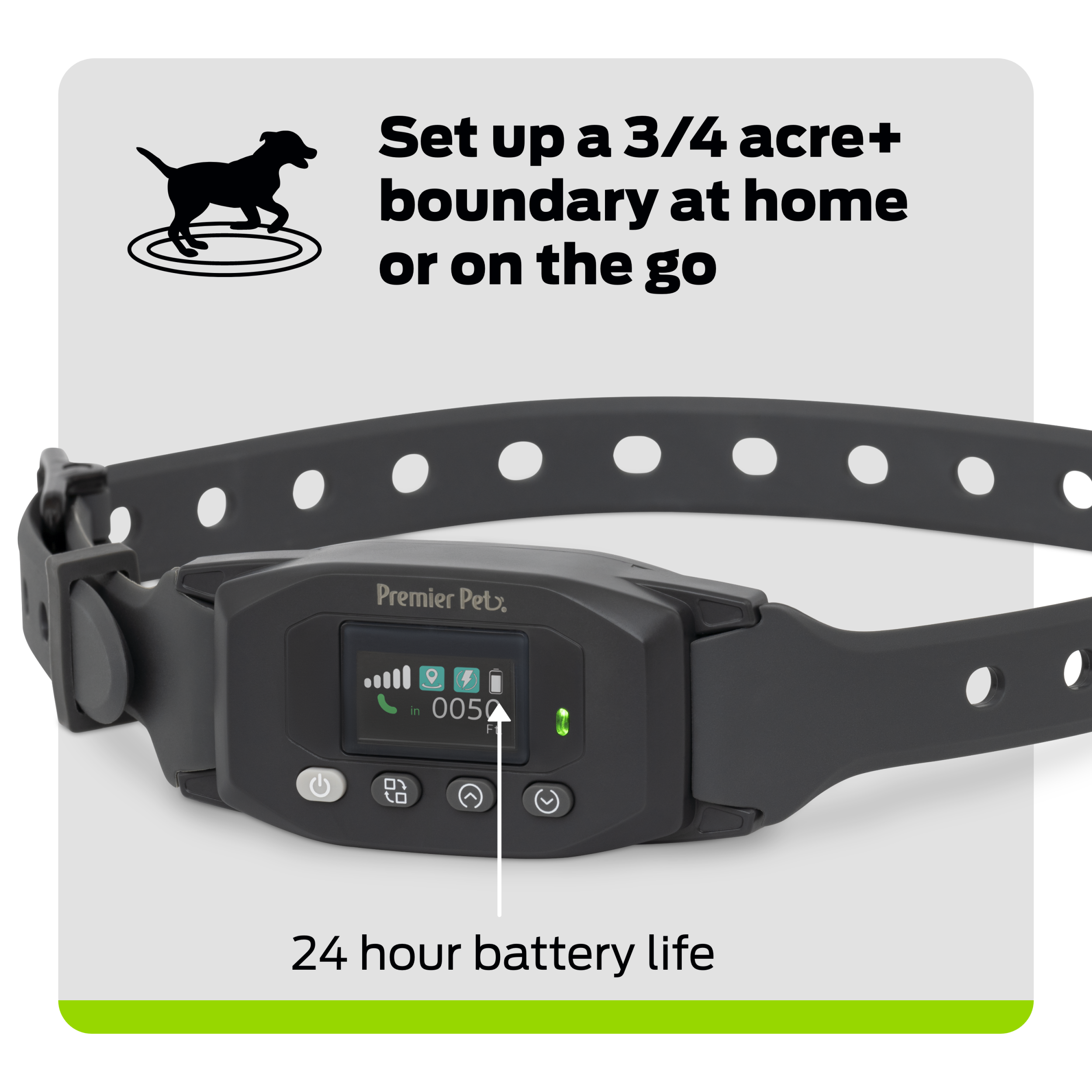 Keep your dog safe in a wireless fence at home or on vacation with the Premier Pet™ GPS Dog Fence. With a GPS-powered circular boundary, this dog fence offers a flexible, reliable and user-friendly way to ensure your dog stays within the limits you set. Give your dog the freedom to play and explore, while you enjoy peace of mind knowing they’re safe. This advanced system uses GPS technology to create a wireless circular boundary that can cover yard sizes of 3/4 acres or more. The setup is a breeze, with all configurations done directly on the collar’s LCD screen, eliminating the need for apps. Plus, with correction-free re-entry, your dog can return into their boundary without any static correction. Choose between 3 levels of correction: Tone & vibration, small-dog static or large-dog static. This water-resistant rechargeable collar is ready for all-day adventures with a battery life of up to 24 hours.