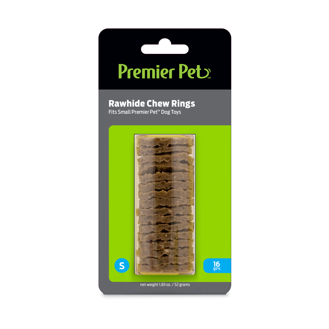 The Premier Pet® Rawhide Chew Ring Refills provide 16 replacement treats for your Premier Pet® Ring Holding Toys. Simply remove the chew rings you need from the package and secure them to the toy. Once added, your dog will stay engaged and boredom free while trying to chew the rings off.