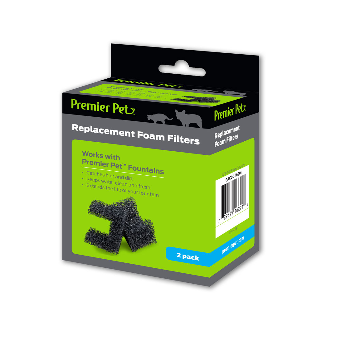 The Premier Pet® Replacement Foam Filters catch any hair and dirt that falls into your pet’s fountain, providing clean water for your pet. This pack contains two filters providing a one to two month supply for your fountain, ensuring your pet always has fresh, clean water. Tip: To ensure the freshest water and a long-lasting fountain, it is recommended to replace your foam filter every one to two months, but more frequently if multiple pets drink from the fountain.